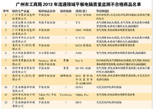 廣州市工商局近日委托廣東產品質量監督檢驗研究院對在廣州市流通領域銷售的平板電腦商品進行了質量監測。據悉,這次監測共抽取了23家生產企業生產的35款樣品平板電腦,并進行了11項檢測。結果顯示,23款樣品合格,12款樣品被判定為監督總體不合格,不合格率為34.29%。