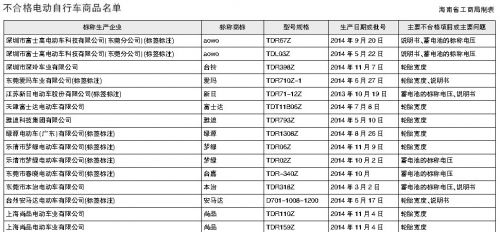 海南省工商局近日公布的電動自行車抽檢結果顯示,有12家企業生產的15個批次電動自行車不合格。不合格電動自行車標稱品牌涉及aowo、尚品、綠源、夢綠、安馬達等。