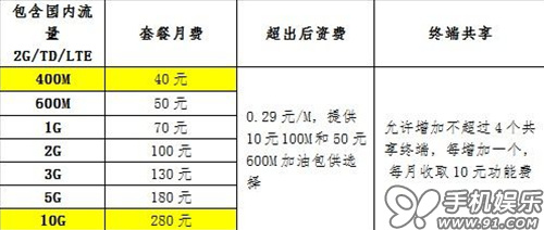 4G流量套餐(注:40元和280元檔將于2014年2月1日上線)