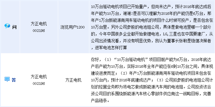 方正電機(002196)周二在全景網(wǎng)互動平臺上透露,“10萬臺驅(qū)動電機”項目目前產(chǎn)能為6萬臺,2016年底達產(chǎn)后產(chǎn)能為10萬臺,實際2016年全年產(chǎn)能應(yīng)在6到10萬臺之間,具體視建設(shè)進度而定。