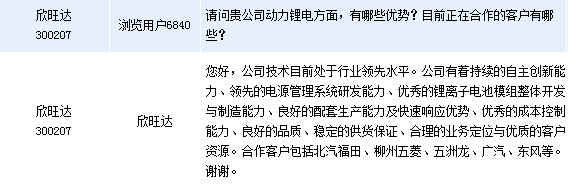 欣旺達(300207)周四在全景網互動平臺上表示,公司動力鋰電方面的合作客戶包括北汽福田、柳州五菱、五洲龍、廣汽、東風等。