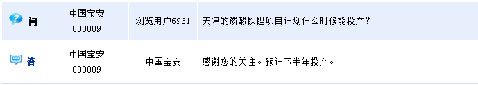 中國寶安(000009)周四晚間在全景網(wǎng)互動平臺上回答投資者提問時(shí)透露,天津的磷酸鐵鋰項(xiàng)目預(yù)計(jì)下半年投產(chǎn)。