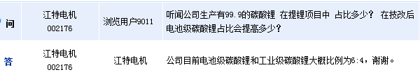 江特電機(002176)周四在全景網互動平臺表示,公司目前電池級碳酸鋰和工業級碳酸鋰大概比例為6:4。
