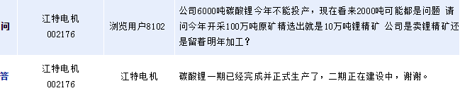 江特電機還表示,碳酸鋰一期已經完成并正式生產了,二期正在建設中。