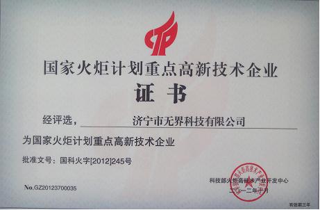 近日,山東濟寧無界科技有限公司收到國家科技部頒發的“國家火炬計劃重點高新技術企業”證書。據悉,2012年全國共評選出784家國家火炬計劃重點高新技術企業,山東省濟寧國家高新區獲得
