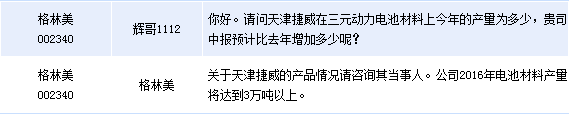 格林美(002340)周三在全景網(wǎng)互動(dòng)平臺上表示,公司目前三元鋰電池正極材料產(chǎn)能5000噸/年,計(jì)劃今年7月擴(kuò)產(chǎn)到10000噸/年。格林美還表示,公司2016年電池材料產(chǎn)量將達(dá)到3萬噸以上。另外,武漢三永格林美汽車零部件再制造有限公司目前已經(jīng)投產(chǎn),目前主要產(chǎn)品是發(fā)電機(jī)、馬達(dá)等汽車零部件。