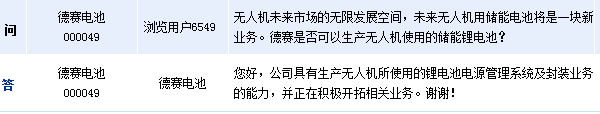 德賽電池周四在互動平臺上表示,公司具有生產無人機所使用的鋰電池電源管理系統(tǒng)及封裝業(yè)務的能力,并正在積極開拓相關業(yè)務。