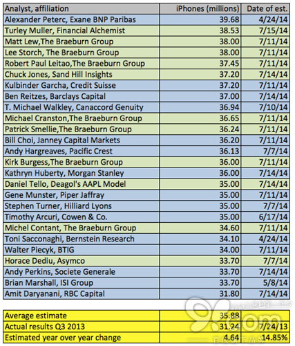 蘋果第三財政季度收入報告大會即將舉行,分析師預測蘋果今年第三財政季度 iPhone 最高銷量可能為4000萬。Fortune 網站統計了來自26位分析師的預測,銷量也從3180萬只4000萬不等,不過分析師們的平均銷量預測為3588萬。