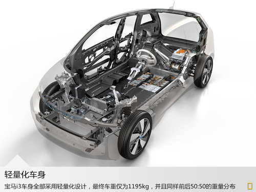 作為寶馬的未來的技術的體現,寶馬i3匯聚了寶馬最新的科技與車中,在車身重量上寶馬i3已經足夠輕質化,僅為1195kg,并且在含有的數量眾多的電池組整車上還做到了前后50:50的重量比,這將保證寶馬i3一定的操控性能。