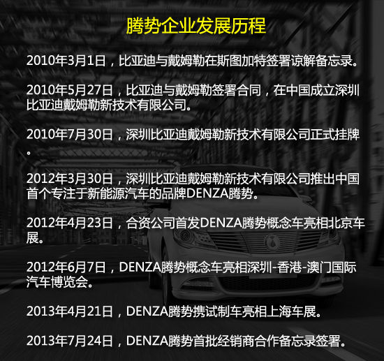 2012年3月30日,比亞迪汽車有限公司和戴姆勒按照50:50投資合資成立的深圳比亞迪戴姆勒新技術(shù)有限公司(BDNT)正式發(fā)布了其全新的汽車品牌——騰勢,英文名稱為DENZA。同時,品牌的口號“EV the Future”也正式發(fā)布。