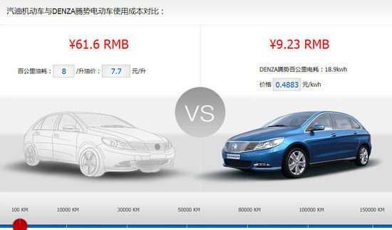 以一臺百公里耗油8L的汽油車為例,目前的平均油價暫定7.7元(93號),那么百公里的使用費用上,汽油車為61.6元,而騰勢則為9.23元,但到了10萬公里的時候,費用差異就非常可觀了,那時汽油車為6.16萬元,而騰勢才為9228.87元。由此能夠看出,購買一臺電動車它能夠獲得多大的后期實惠。