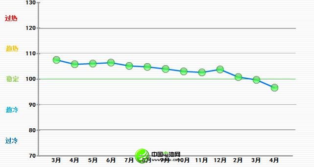 4月份中輕景氣指數為96.70,位于“穩定”區域。與3月份相比,中輕景氣指數回落3.06。