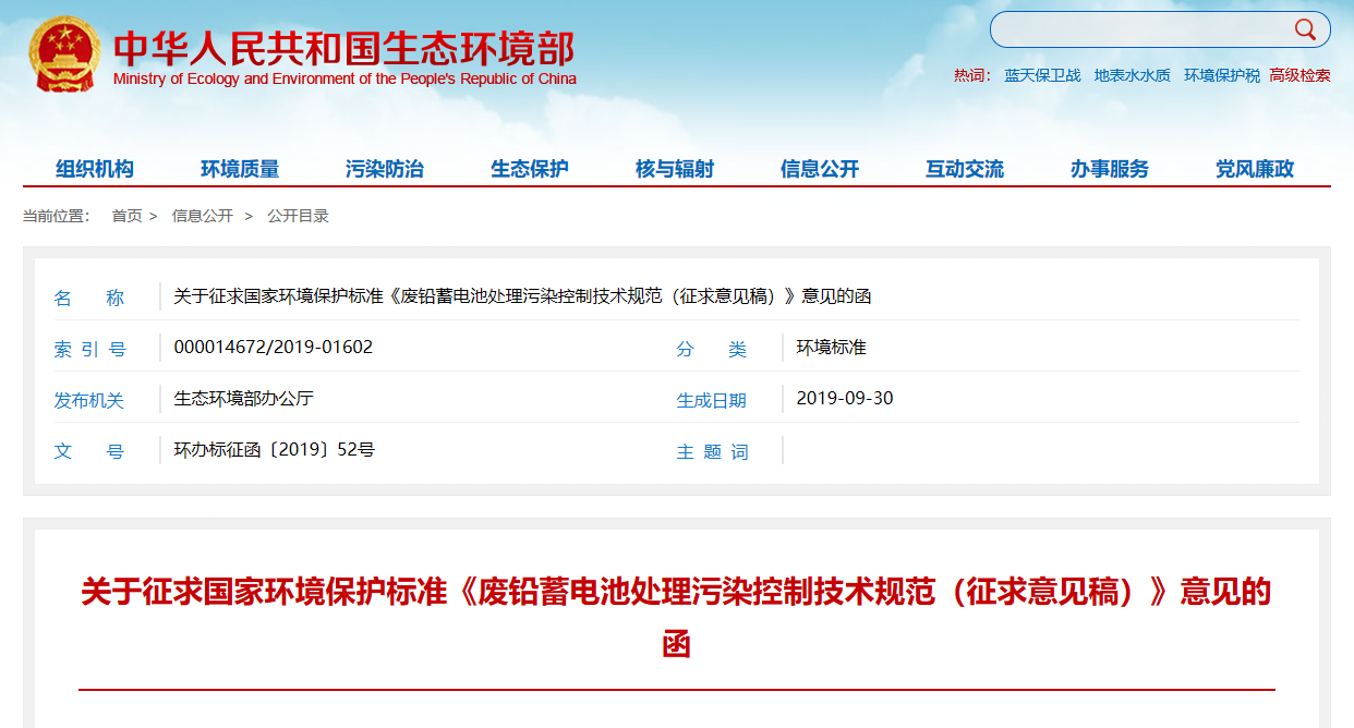 生態環境部:廢鉛蓄電池處理污染控制技術規范(征求意見稿)