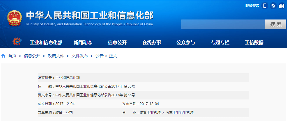 2017年12月4日,工業和信息化部在官方網站發布了第302批《道路機動車輛生產企業及產品公告》。申 ... 查閱全文