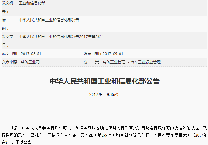 工信部公示第299批新車 309款新能源車產品申報