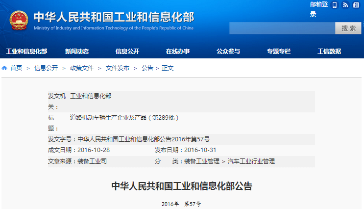 工信部:道路機動車輛生產企業及產品(第289批)公布