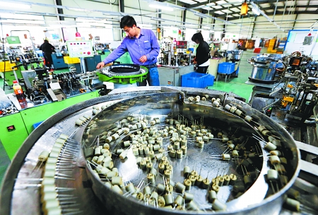 8月2日,淮濱縣鑫展電子有限公司員工正在生產鋁電解電容器。該企業從深圳轉移到該縣產業集聚區,已形成了年產7億只鋁電解電容器的生產規模。記者 王天定 攝
