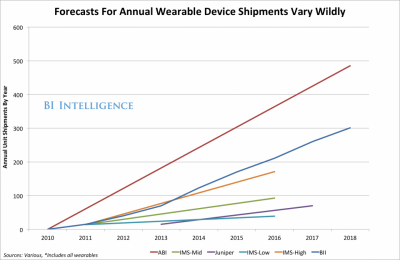 市場前景:業(yè)界認為,可穿戴設(shè)備總體潛力巨大,不過智能手表可能難以成為深受大眾消費者歡迎的電子產(chǎn)品,但是,智能手表舒適的腕帶、可裝入用戶口袋以及追蹤行動等功能可能會吸引更多的消息者市場,特別是醫(yī)療行業(yè)和企業(yè)用戶可能會喜歡智能手表這款產(chǎn)品。業(yè)界認為,2014年全球可穿戴設(shè)備的單位出貨量將突破1億,預(yù)計從現(xiàn)在起的五年之后將達到3億。