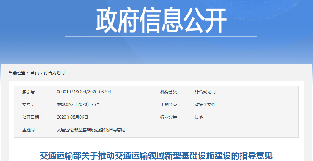 8月6日,中華人民共和國交通運輸部發布了《交通運輸部關于推動交通運輸領域新型基礎設施建設的 ... 查閱全文