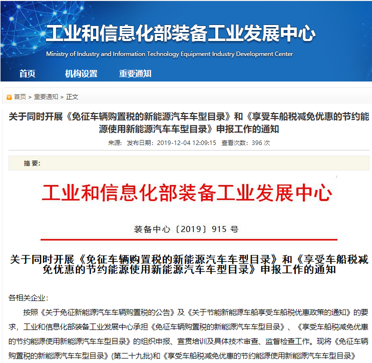 工信部:新能源汽車免征車輛購置稅車型目錄和享受車船稅減免優(yōu)惠開始申報