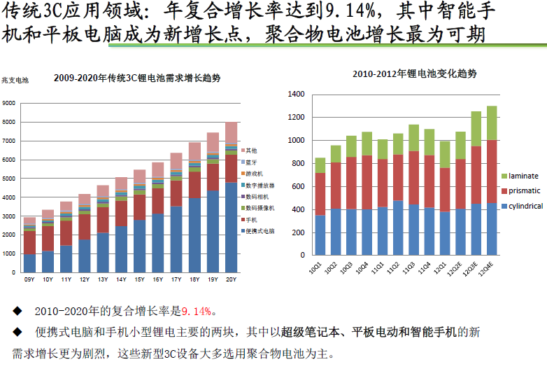 2010-2020年的復合增長率是9.14%。 便攜式電腦和手機小型鋰電主要的兩塊,其中以超級筆記本、平板電動和智能手機的新需求增長更為劇烈,這些新型3C設備大多選用聚合物電池為主。...