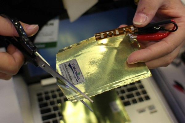 ProLogium在演示時該電池技術時接通一個LED,可以看到任何扭曲彎折之后,LED都照常發亮,甚至在裁切之后仍能正常供電。...