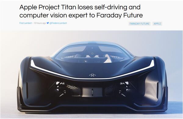 • 蘋果造車再受打擊?自動駕駛團隊核心成員跳槽FF 日期:2016-08-17 08:34:59 點擊:189 好評:0